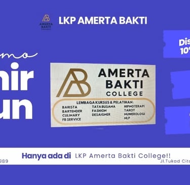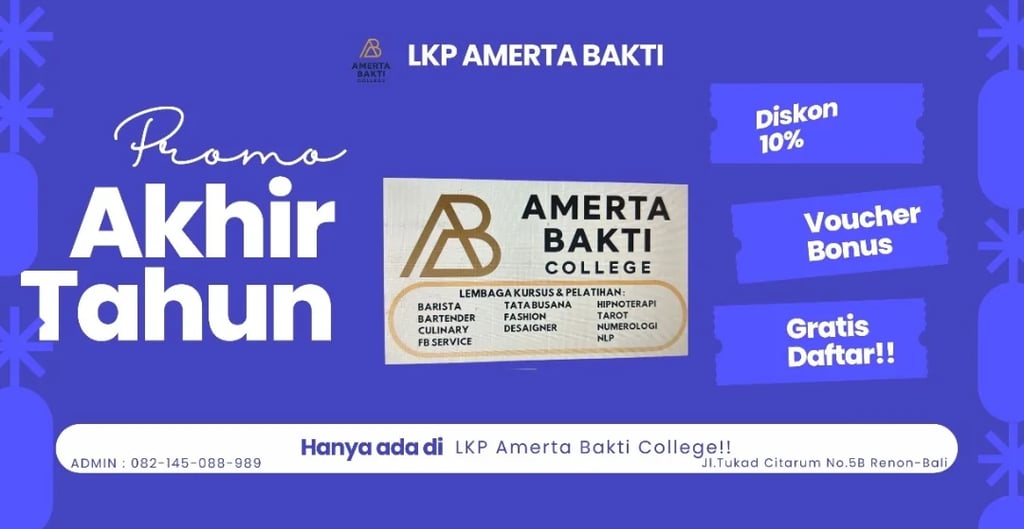 Amerta Bakti College resmi membuka pendaftaran untuk berbagai program kursus unggulan mulai dari bidang Hospitality, Fashion Design, hingga pengembangan diri seperti NLP dan Hipnoterapi di pusat kota Denpasar.